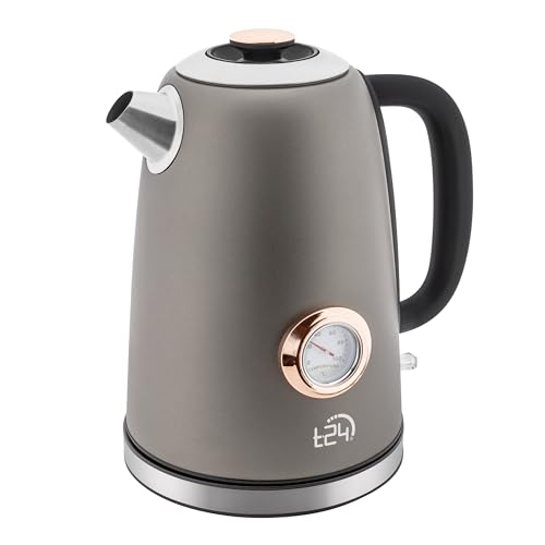 T24 Vattenkokare retrodesign i grått matt – vattenkokare rostfritt stål med analog termometer – vintage vattenkokare 1,7 liters kapacitet – med automatisk avstängningsfunktion, kedja