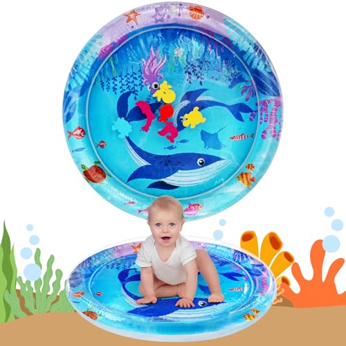 Aolso Vattenmatta för baby, runda uppblåsbara lekmattor, 100 x 100 cm, påfyllningsbar med vatten, BPA-fri vikbar vattenlekmatta, babyleksak 3 6 9 månader – sigillstil (blå)