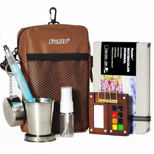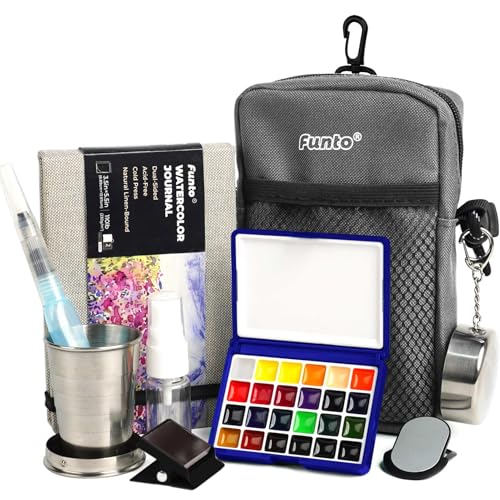 Funto Mini Watercolor Paint Set, All-In-One 24-Frg Premium Fickresesmlarutensil, med axelryggsck, watercolor journal, vattenpensel, mlvaskskla och magnetisk klick, ideal fr konstentusiaster
