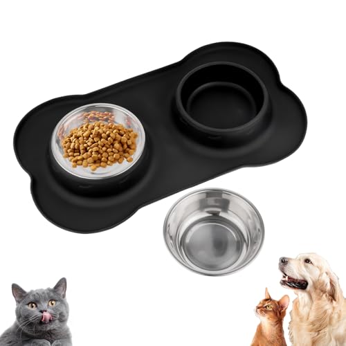 Foderskål hundar katter, matskål hundskål små hundar skålset, rostfritt stål kattskål vattenskål hund utan att läcka, med 1 hundskål underlag halkfri silikonbricka matta (36 x 21 cm)