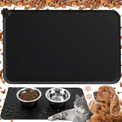 Skålunderlägg hund katter, fodermattor för hundar, vattentät och halkfri silikon matskål, för matskålar vattenskål, fodermatta, 48 x 30 cm, svart