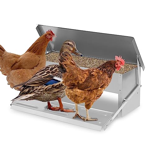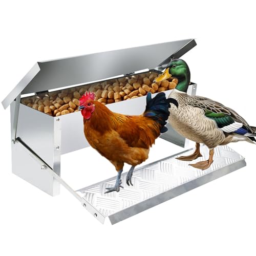 Randaco Utfodrare för hönsmatare av galvaniserat stål 5 kg foderdispenser fodertråg med automatisk pedal och vattentät filt, kycklingfoder för fjäderfä, vattentät och råttsäker