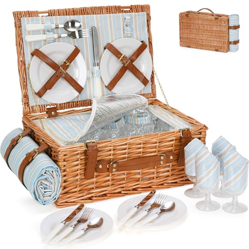 Flätad Picknickkorg, picknick, set för 4 med stort isolerat kylfack, vattentät filt och bestick, servis, kit, retro, klassisk, pilträd, för camping, utomhus, fest (klassisk)