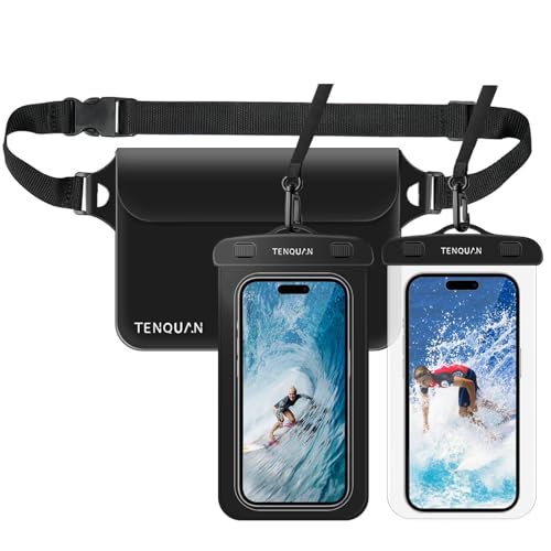 TENQUAN 2 vattentät mobiltelefonväska fodral & 1 vattentät påse torr väska fodral midjerem med midja/axelrem pack, svart (2 fodral + 1 påse)