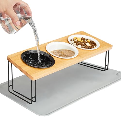 Ousiya förhöjda kattskålar kattmat vattenskålar med naturligt bambustativ, 3 keramiska rätter – 15° lutad design för optimal ätning, förebyggande av kräkningar och vattentät matta