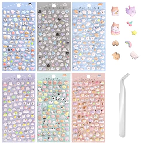 APOMOONS 6 st 3D geléklistermärken djur söta klistermärken och pincetter, 3D-klistermärken set mini puffy Kawaii vattentäta djurklistermärken, för mobiltelefon, anteckningsbok, dagbok