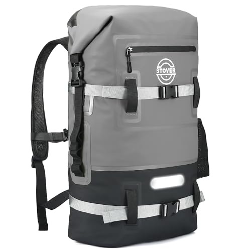 STOVER Vattentät ryggsäck slitstark Roll-Top stängning flytande torr väska med framficka vadderad bakpanel och reflekterande remsa, Grå, Torrväska ryggsäck