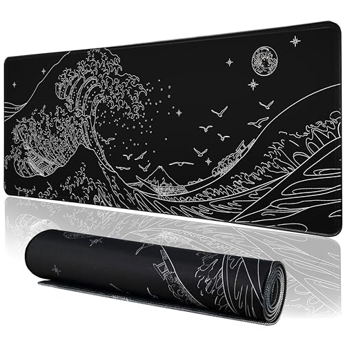 MEWOOCUE Svart musmatta för bärbar dator, havsvåg stora skrivbordsunderlägg PC tangentbord vattentätt och halkfritt 30 x 30 cm 3 mm tjock XL, XXL gummi bordsmatta, Kanagawa surfing och japanska