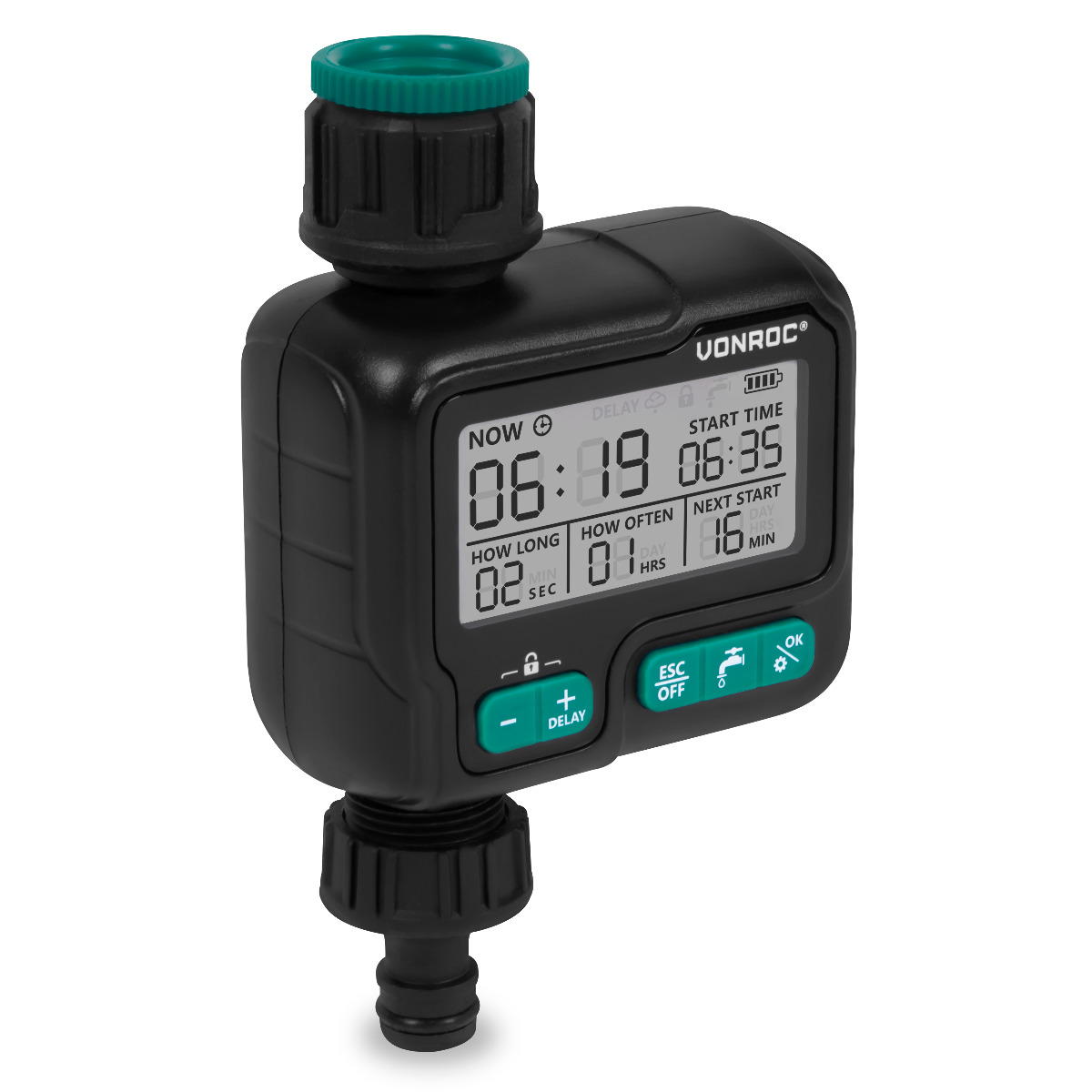 Vattningstimer, automatisk vattentimer, trädgårdsslang, gårdsbevattning, 3 displayer, regnfördröjning, barnkontroll