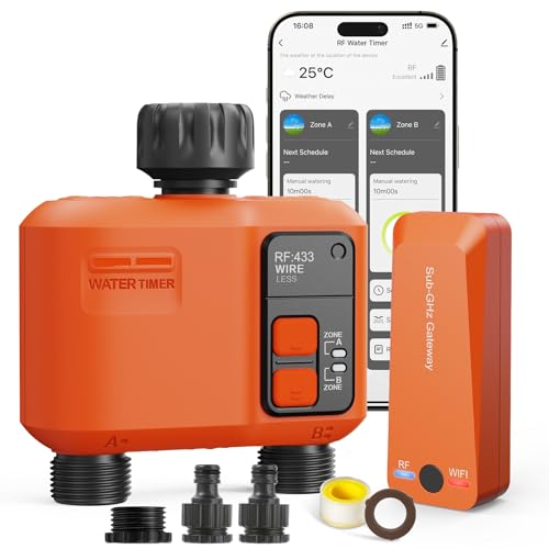 Smart sprinklertimer 2 zoner WiFi-vattentimer, 299 m RF-räckvidd, bevattningskontroller, app/röstkontroll, regnfördröjning