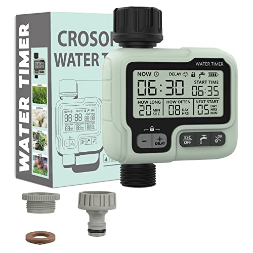 CROSOFMI Digital vattentimer, sprinklertimer programmerbar med regnfördröjning, trädgårdsslang timer för bevattning med stor LCD-skärm, manuellt bevattningsläge, IPX5, vattentät, för trädgård, gräsmatta, uteplats, bondgård.