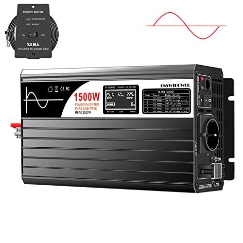 Novopal Växelriktare 1500W/3000W 12v Ren Sinusvåg 220v 230v Spänningsomvandlare Inverter 2 x AC-uttag Effektinverterare med LCD och, 2.4A USB-portar inkl. 5 meter fjärrkontroll för bil, båt, camping