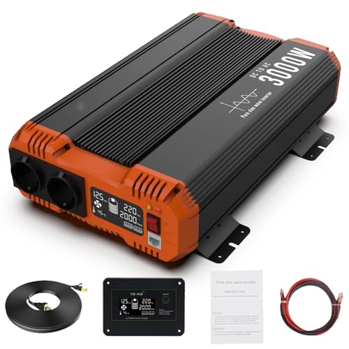 3 000 W (6 000 W toppström) växelriktare ren sinusvåg ström 12 v till 220 v solcellsinverter med LCD-display, spänningsomvandlare med EU-uttag, bilväxelriktare för lastbil husbil hem med fjärrkontroll