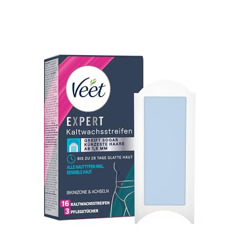 Veet Expert Kallvaxremsor, bikinizon och armhålor – vaxremsor för hårborttagning för alla hudtyper inklusive känslig hud – 8 dubbla remsor = 16 ränder
