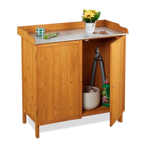Relaxdays Växtbord med underskåp, trä, tennbänkskiva, H x B x D: 94 x 94 x 47 cm, utomhus trädgårdsskåp, orange
