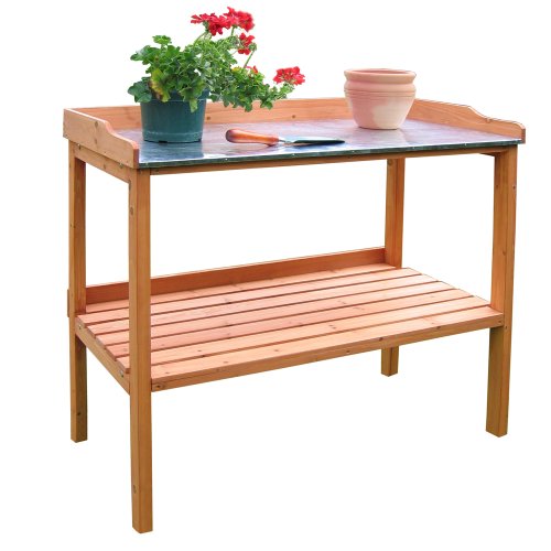 Yaheetech Växtbord med galvaniserad bänkskiva, väderbeständigt trädgårdsbord, blombord, träväxtbord med underskåp, förvaringsyta och låda för trädgården/terrassen/balkongen