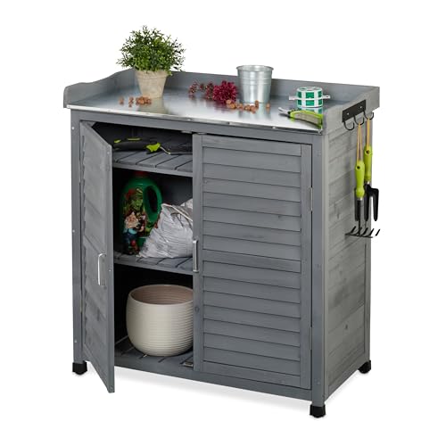 Relaxdays Växtbord med underskåp, 3 krokar, trä, tennbänkskiva, H x B x D: 92 x 90 x 45 cm, trädgårdsskåp, grått