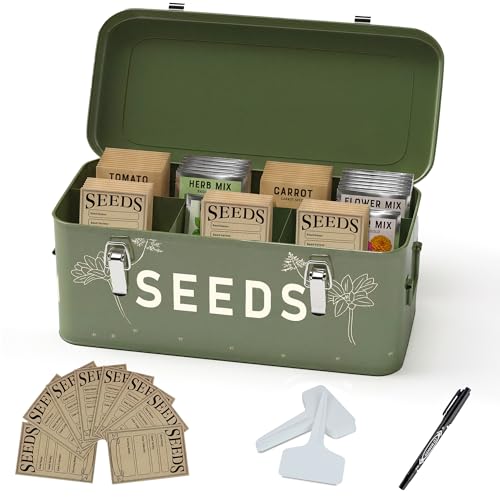 Orionstar Fröförvaringsorganisatör, metallfrö sparlåda med lock, frökorg med 30 växtetiketter 30 frökuvert 1 markörpennor, 4 fack låda med säkerhetslås, svartgrön