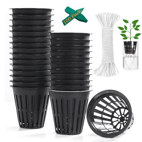 ORIMERC 100 st 5 cm (100 tum) nätkrukor med 30,5 m självvattnande veke och 100 växtetiketter för hydroponik, Kratky, inomhus och utomhus, UV-beständig, BPA-fri