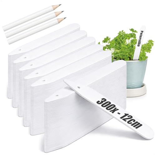 COM-FOUR® 300x växtetiketter med penna - plug-in etiketter 12 cm för rum, balkonger, trädgårdar - växtpluggar för märkning - odlingspluggar för bäddar och krukor (300 stycken - vit - 12cm)