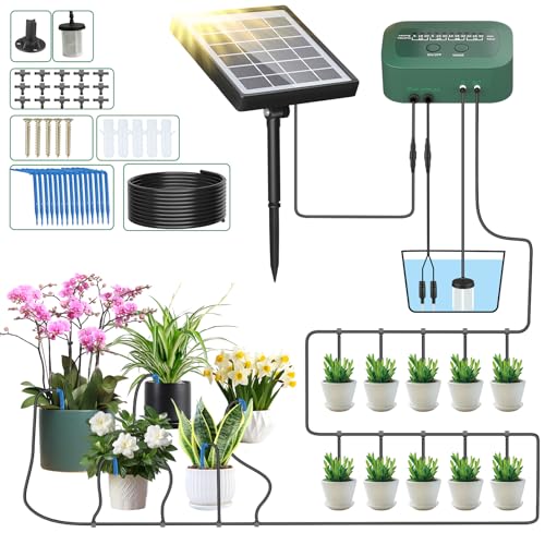 PChero Solcellsbevattningssystem med timer, automatiskt bevattningssystem med 15 m slang för trädgård, växthus, balkongkrukväxter, grönsaker, utomhus och inomhus