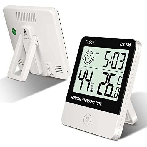 Flintronic Termometer, hygrometer, inomhus, mini LCD-display för tid, temperatur, luftfuktighetsmätare med inomhusklimatindikator för inomhusbruk, hem, kontor, skola, hotell och växthus (9 x 10 cm)