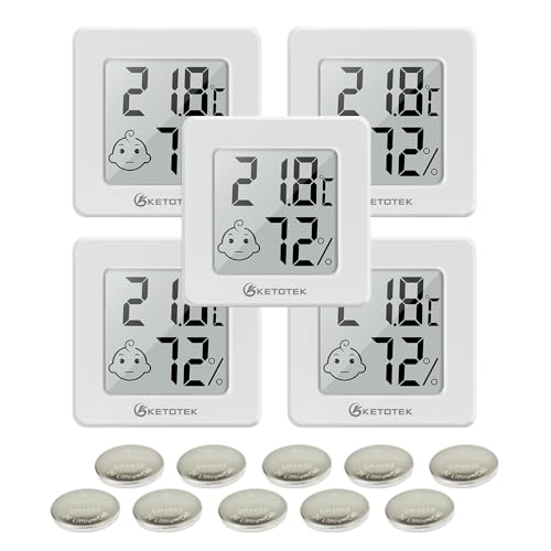 KETOTEK Digital minihygrometer termometer inomhus set om 5 termohygrometer, luftfuktighetsmätare, rumstermometer med rumsklimatindikator för växthus, vardagsrum (vit)
