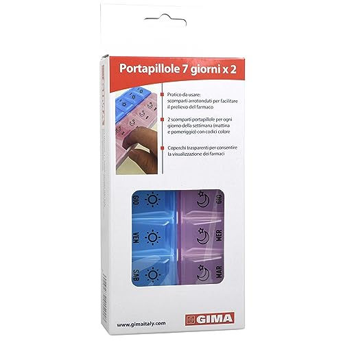 Gima - 7 dagar x 2 veckopiller, solsymbol för morgonen, månen och stjärnsymbolen för växthuset, italienska språket, 2 genomskinliga färger, rosa och blå, kompakt och bärbar.