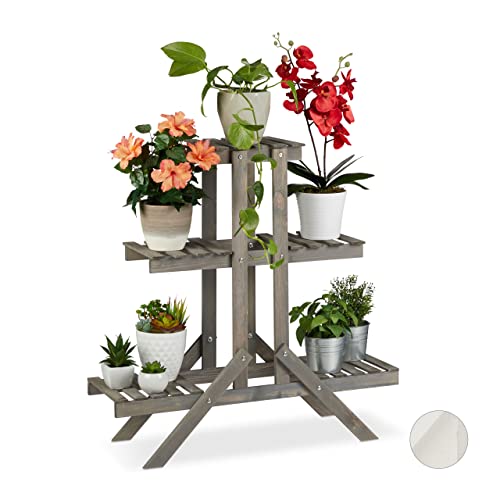 Relaxdays träblomkruka, 3 nivåställ, växtstativ, HWD: 83 x 83 x 25 cm, grå, 83 x 83 x 28 cm