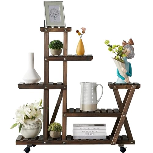Venhvorer 5 djur träblomhylla, växthylla med valfria hjul, flera våningar, blomställ, växtstativ, blombänk, blomtrappa, växttrappa, stående hylla för inomhus, trädgård, balkong, dekoration