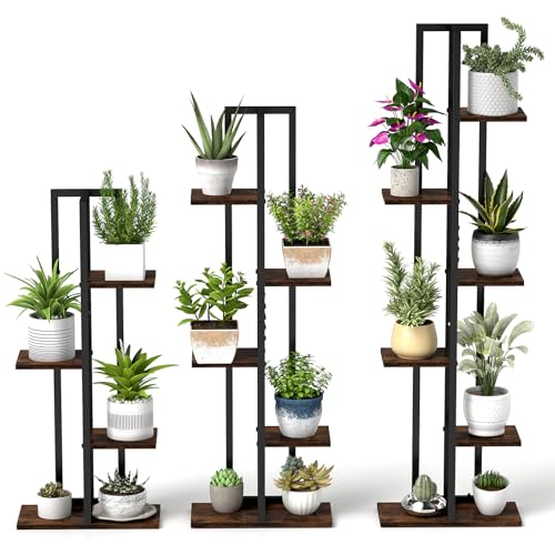 COSTWAY 3 växtstativ set, 4 + 5 + 6 våningar, blomställ av trä och metall, blomhylla, växthylla, vintage, blomtrappa, växttrappa, för inomhus utomhus balkong, trädgård, svart + brun
