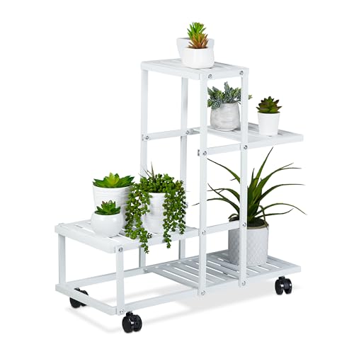 Relaxdays växtställ, 4 hyllor, växttrappa för blommor och örter, blomstativ i metall med hjul, stål, vit