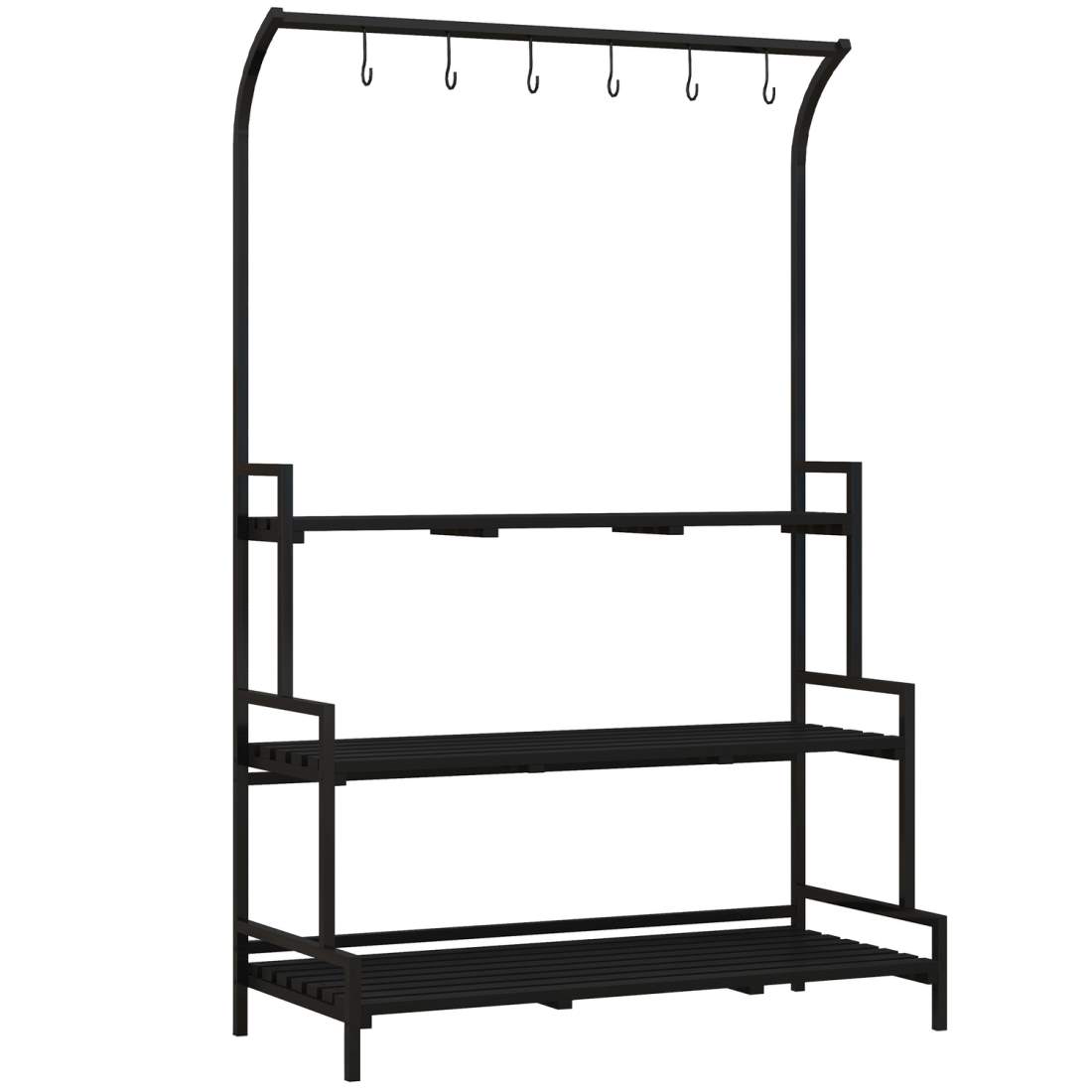 Växtställ blomsterställ med 3 plan och 6 krokar, växttrappa av stål i svart, 110x50x170cm för trädgård och balkong