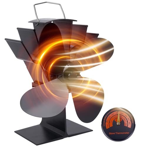 MIVITOOM Vedbrännare fläkt med 6 blad – vedeldad spis fläkt värmedriven, miljövänlig cirkulation för trä/timmerbrännare/öppen spis tillbehör, termometer ingår