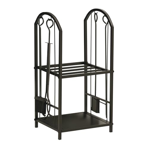 Amagabeli Vedhylla med 4 spisverktyg, 72 x 46 x 30 cm, vedställ för öppen spis eller kamin, passar även utomhus, med 2 hyllor i trä, av smidesjärn, vedförvaring