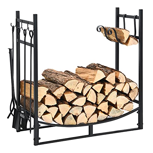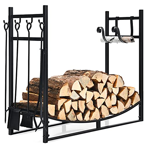 COSTWAY Vedhylla med 4 delar Kaminbestick-set, vedhylla, metall, vedställ, kamintillbehör, vedhylla, öppen spis, svart (76 x 33 x 76 cm)