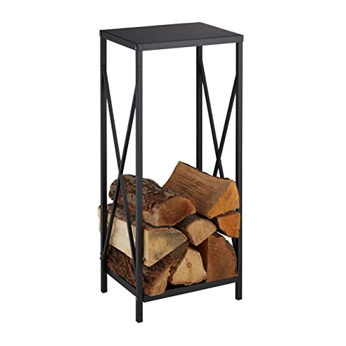 Relaxdays Vedhylla, metall, HBT: 80 x 34 x 25 cm, invändig vedhylla pulverlackerad, trälager, svart