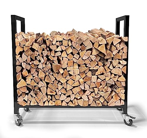 DanDiBo Vedhylla, inomhus, metall, svart, vedställ 85 cm med hjul 96359, vedvagn, träkorg, vedhållare, trähylla