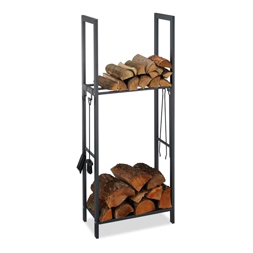 Relaxdays, antracit vedhylla med 2 hyllor, av stål, 4 krokar för eldbestick, vedhylla HBT 150 x 60 x 30 cm, 150 x 60 x 30 cm