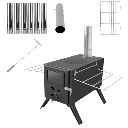 Tältugn, bärbar vedkamin campingkamin med vikbara ben 7 skorstensrör litet campingkök med avtagbar förvaringshylla campingugn för grillkvällar, picknick, camping, uppvärmning