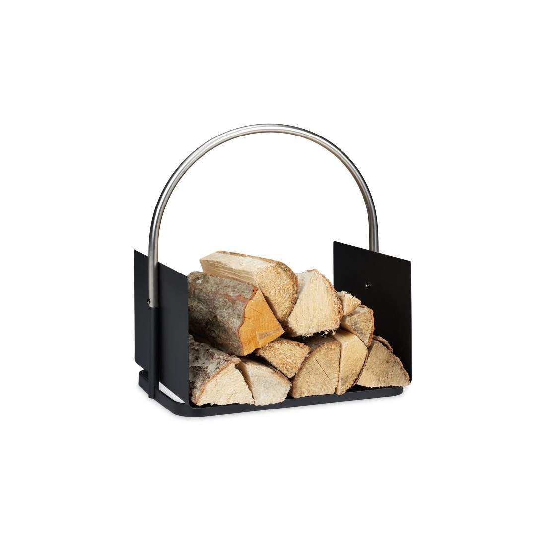 Relaxdays Vedkorg, metall, förnicklat handtag, vedkorg inuti, trähållare, H x B x D 43,5 x 40,5 x 30 cm, svart