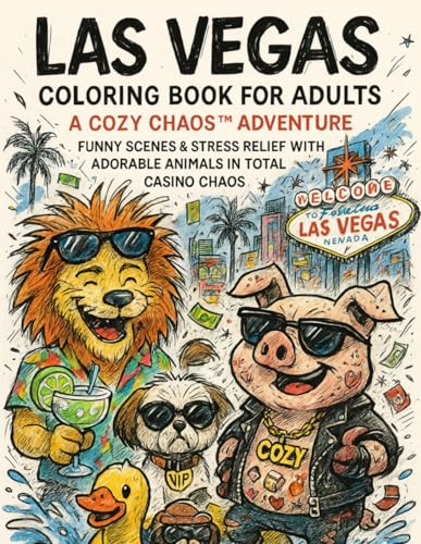 Las Vegas Coloring book for adults. A cozy chaos adventure.: Funny scenes & stress relief with adorable animals in total casino chaos.