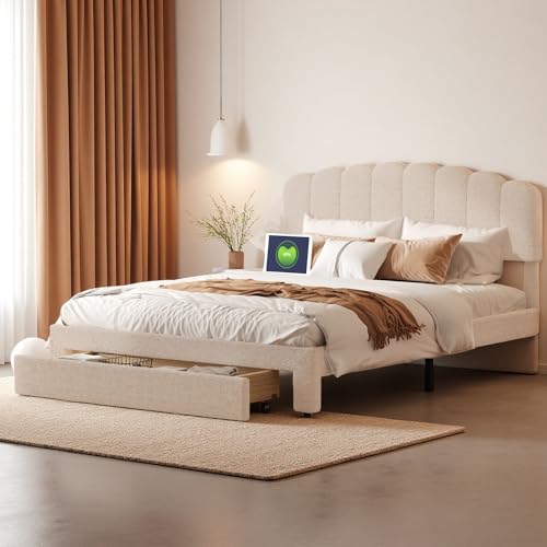 Sängklädselsäng 140 x 200 cm med förvaringslådor, dubbelsäng med USB, sängram med ribbotten och sänglåda, ungdomssäng, funktionell förvaringssäng, utan madrass, teddy velvet, beige