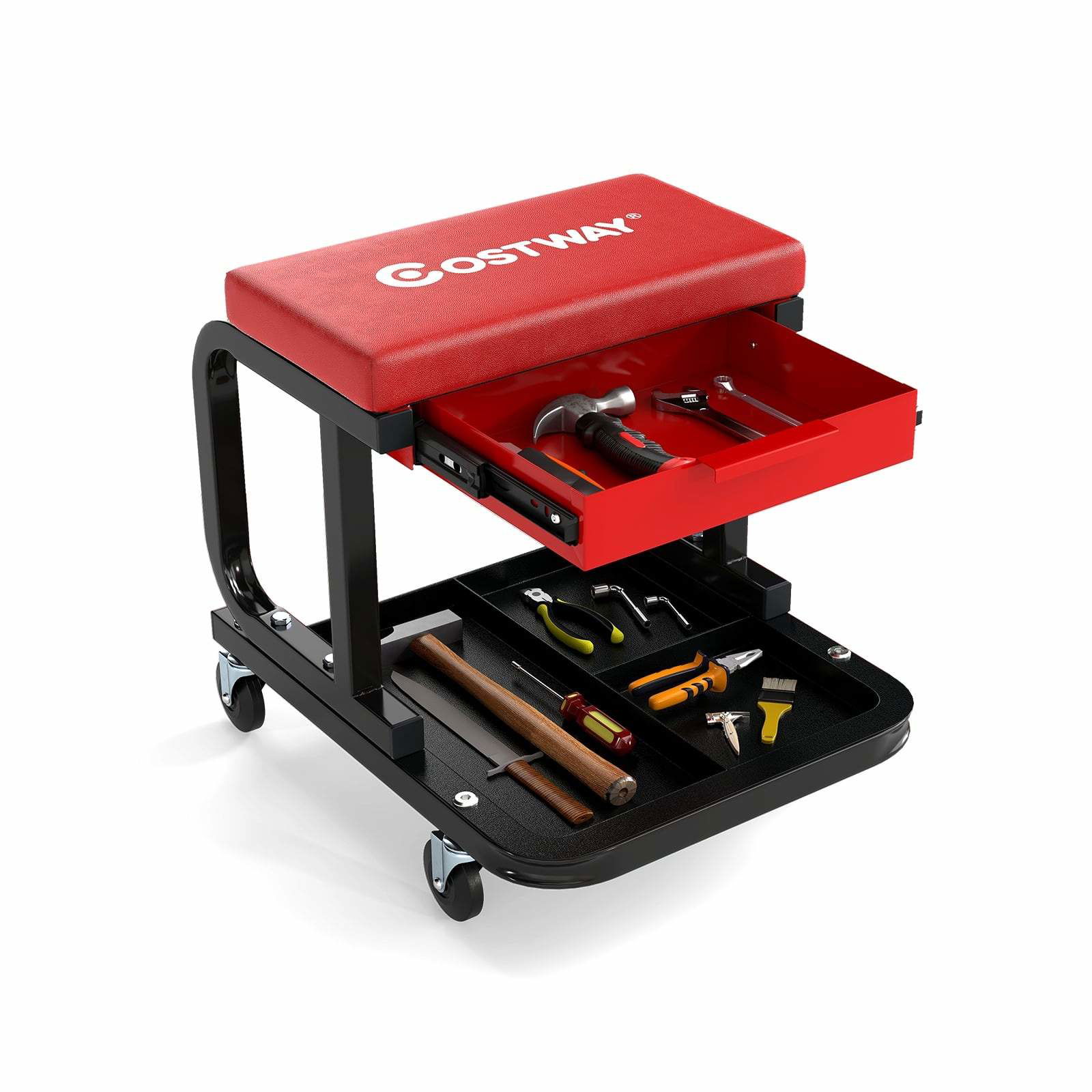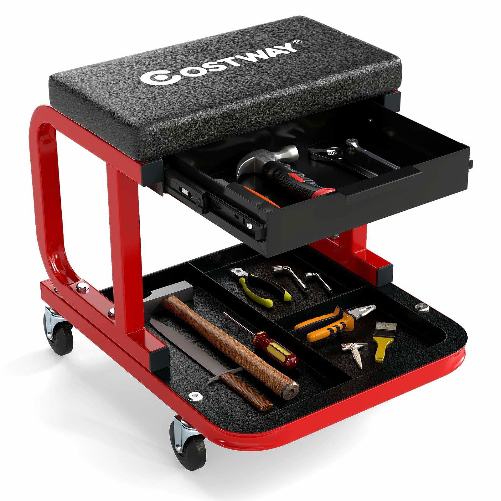 COSTWAY Verkstadspall, 150 kg, verkstadssäte med 2 lådor och lådhållare & hylla och avtagbar sits, arbetspall med hjul, garagepall, monteringspall, rullpall, röd