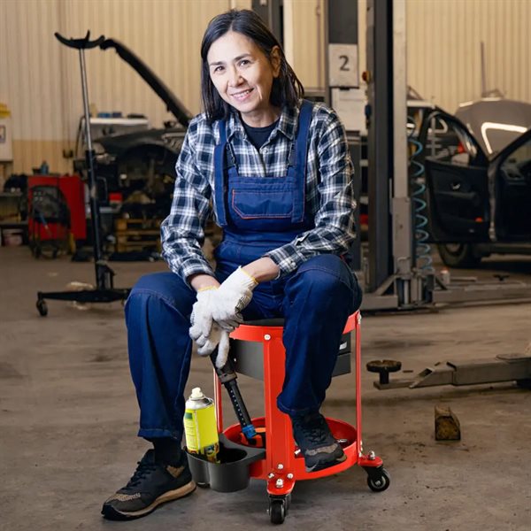 Höjdjusterbar verkstadspall 150 kg lastkapacitet med verktygsbricka verkstadsstol röd