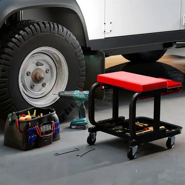 Verkstadspall med hjul – rullande mekpall / arbetspall för garage och verkstad