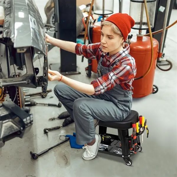 Verkstadspall med hjul och verktygsfack – mekanikerpall med avtagbar sits