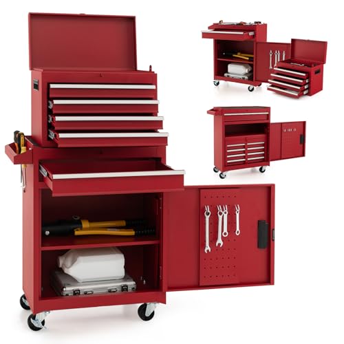GOPLUS 2-i-1 verktygsskåp av metall, kombinerat rullskåp med bärbar verktygslåda, mobil verkstadsvagn med 5 lådor och halkfria mattor, för verkstad och hushåll (röd)