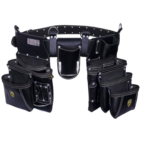 ZAKCO PRO-19 Verktygsbälte med flera fickor för snickare, äkta fullnarvigt svart läder, slitstark konstruktion, 2 läderpåsar, verktygsbälte för hantverkare, takverktygsbälte & verktygsorganisering