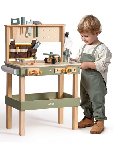 ROBUD Träarbetsbänk barn, leksaksverktygsbänk med verktygsbälte, barnverktygsset, skyddsglasögon, ritpapper för rollspelskonstruktion, pojkar flickor leksaker från 3–5–6–8 år, gåva